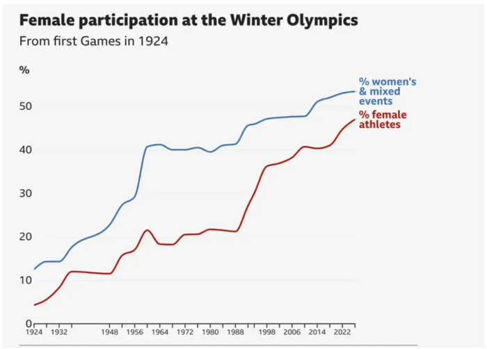 回顾冬奥会历史,早期的赛事几乎被男性运动员“垄断”。1924年首届冬奥会(当时称“冬季运动周”)在法国夏蒙尼举行,参赛的258名运动员中仅有11名女性,占比不足5%。即便到了20世纪末,女子项目仍集中在花样滑冰、越野滑雪等少数类别。而2026年米兰-科尔蒂纳冬奥会,则有望成为历史上性别最平等的一届冬奥会。